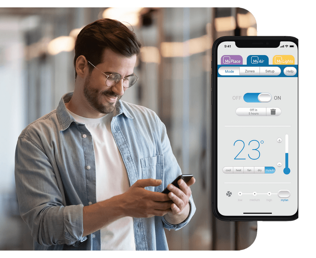 Create your own personalised air conditioning experience with the MyAir app via any IOS or Android smart device. The MyAir app functions as a remote control giving you more control over how you want to use your air conditioner and where you use it. Turn MyAir on before you leave work and always come home to comfort. Adjust the airflow without getting off the couch. Or put your mind at rest and check that you really did turn the air-con off before going on holiday. See our list of compatible phones and devices here.
